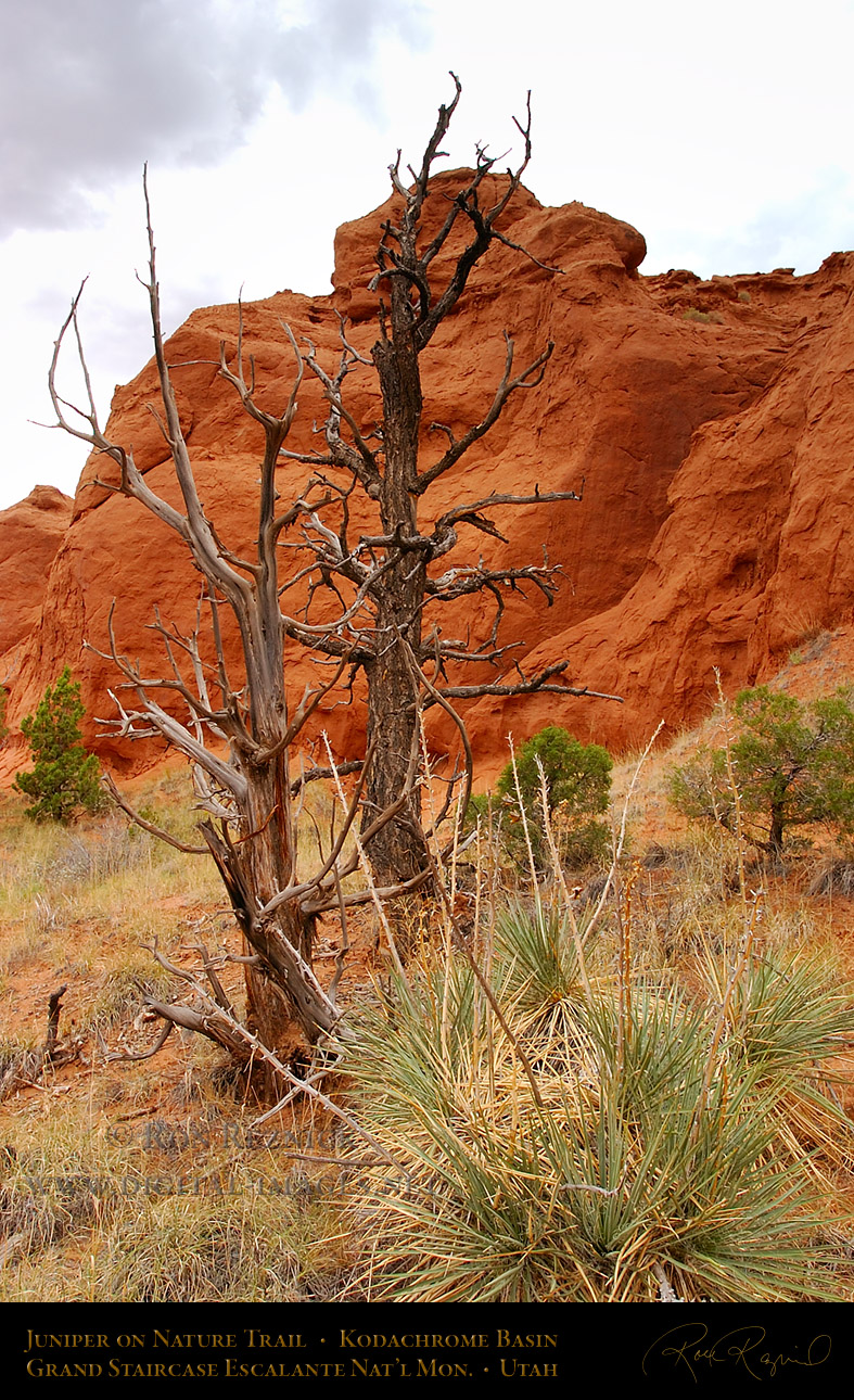 Juniper skeletons, Yucca, Pinion Pines and an orange wall of Entrada Sandstone on the Kodachrome Basin Nature Trail.