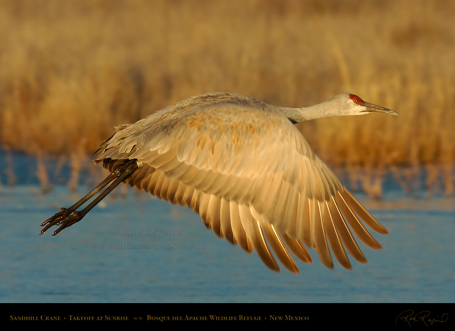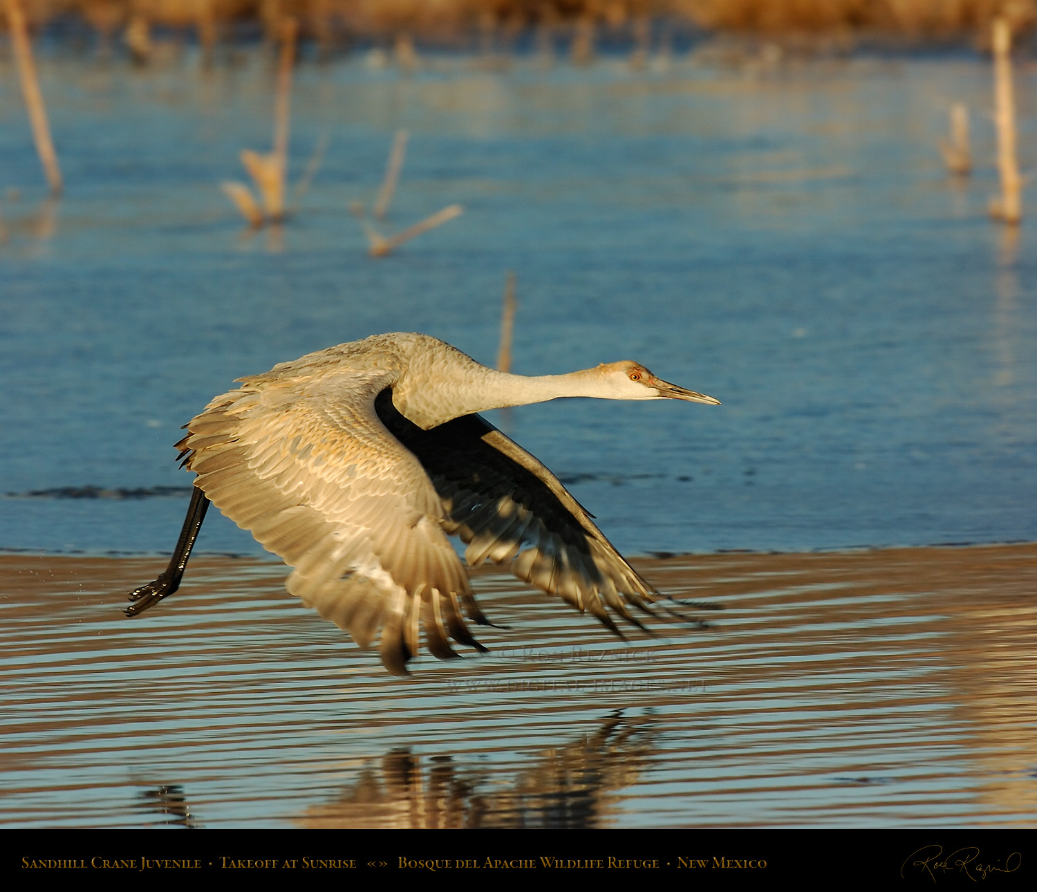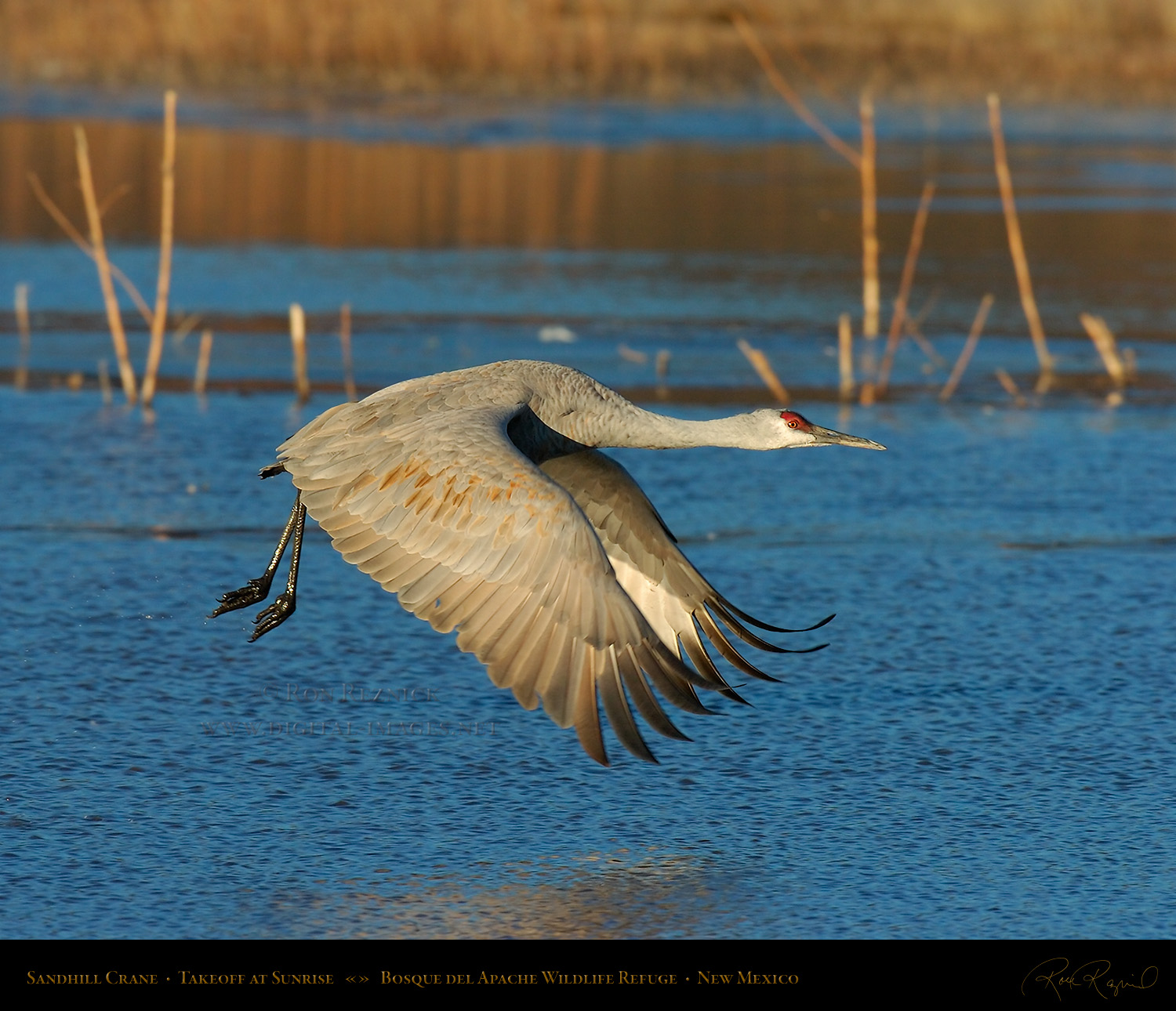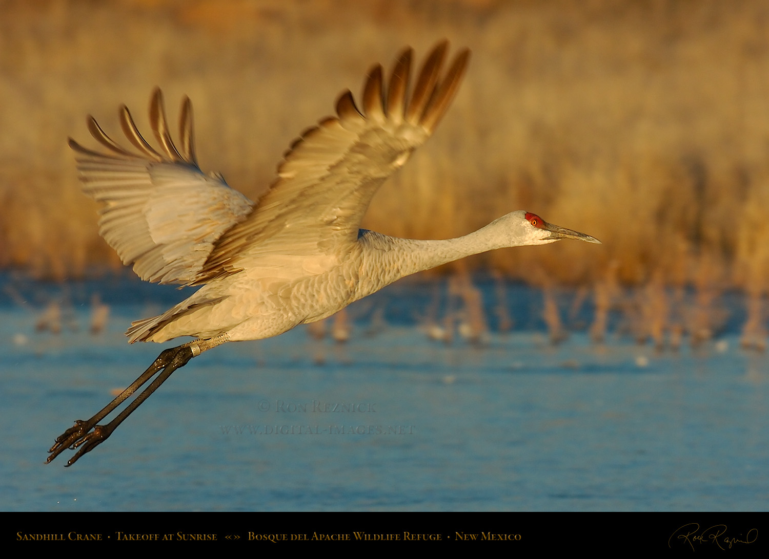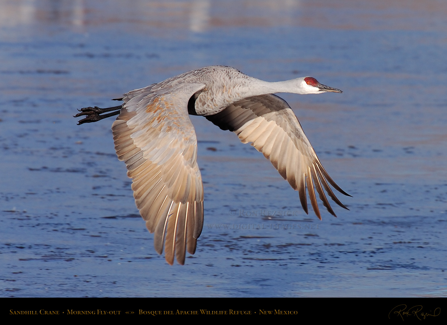 A Sandhill Crane in flight from the Main Pond at Bosque del Apache on a sub-zero January morning. If you look closely, you can see a ring of ice still attached to its leg after it broke out of the frozen pond.