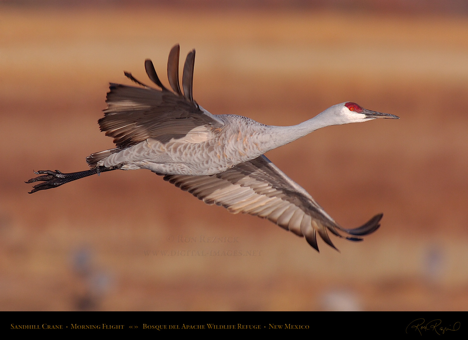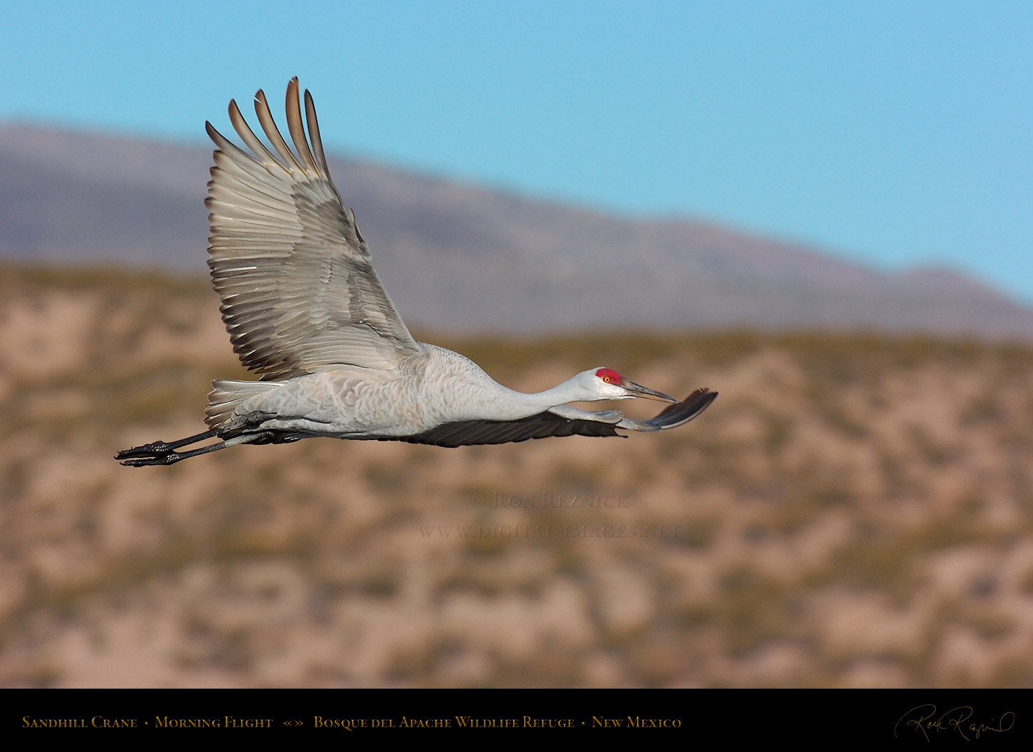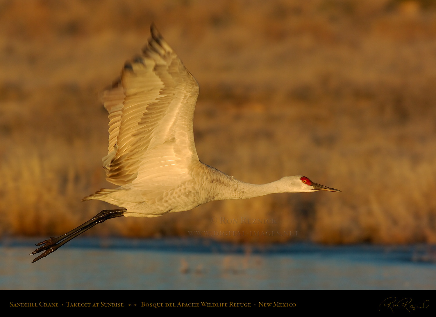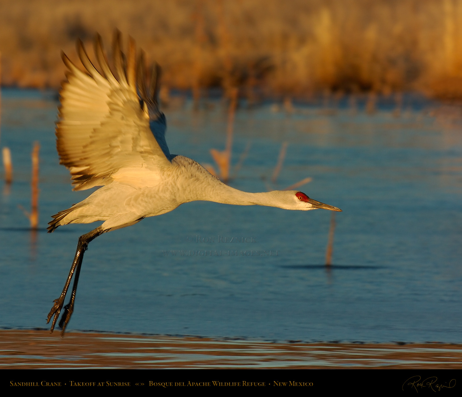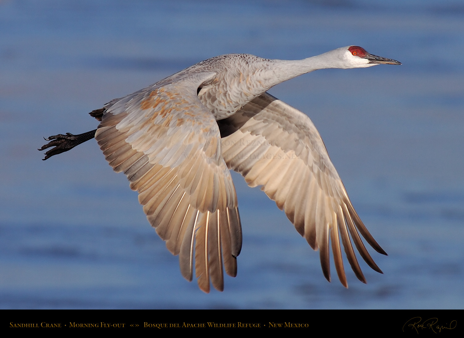 A Sandhill Crane in flight from the Main Pond at Bosque del Apache on a sub-zero January morning. If you look closely, you can see a ring of ice still attached to its leg after it broke out of the frozen pond.