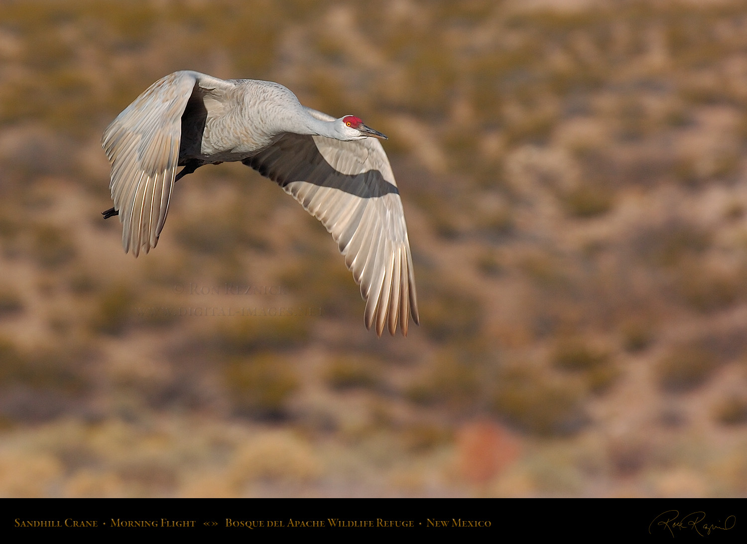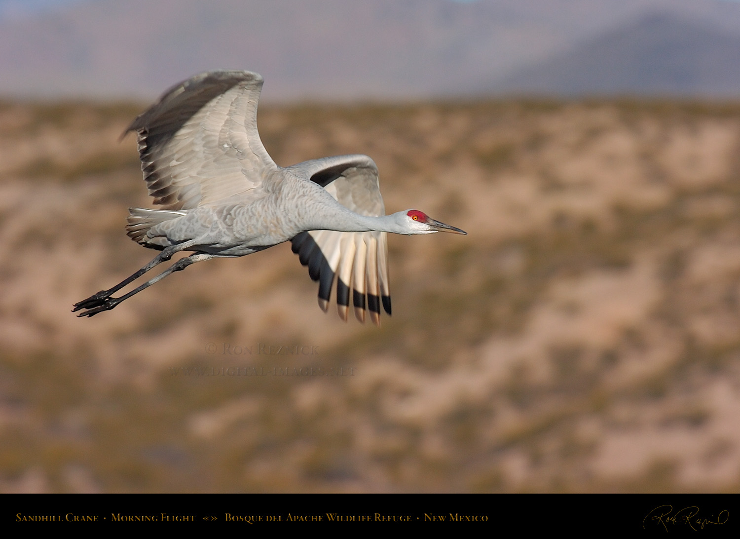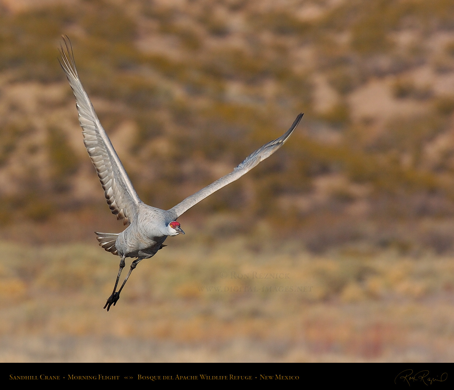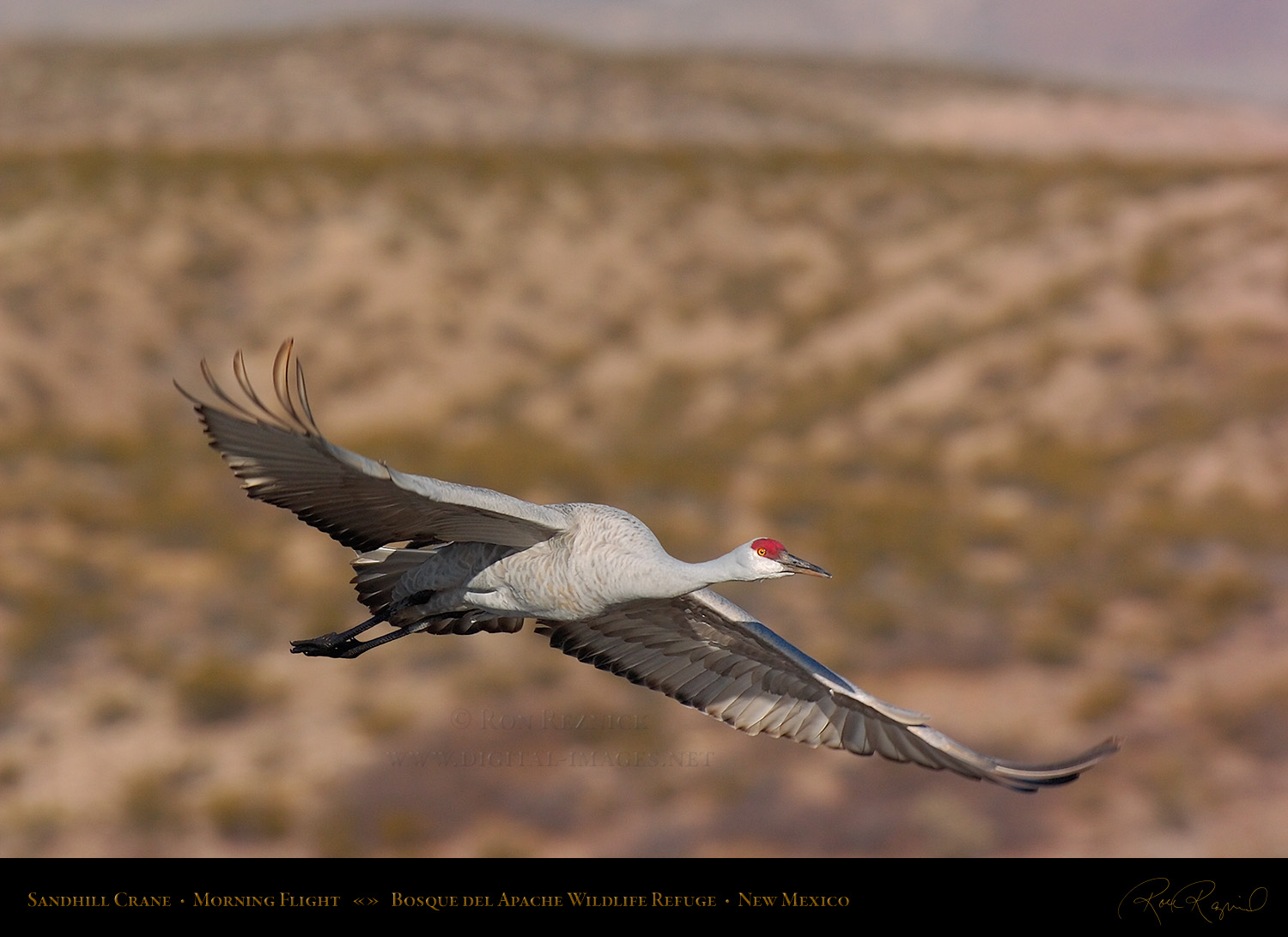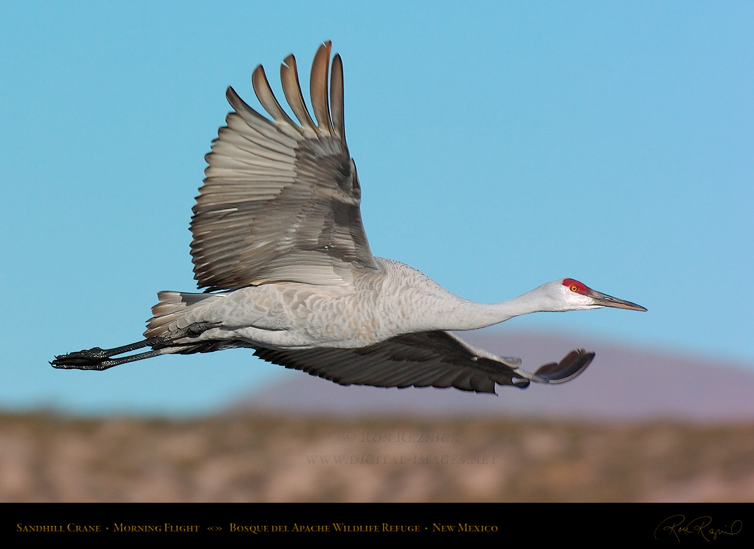 A Sandhill Crane in flight from the Main Pond at Bosque del Apache on a sub-zero January morning. If you look closely, you can see a ring of ice still attached to its leg after it broke out of the frozen pond.