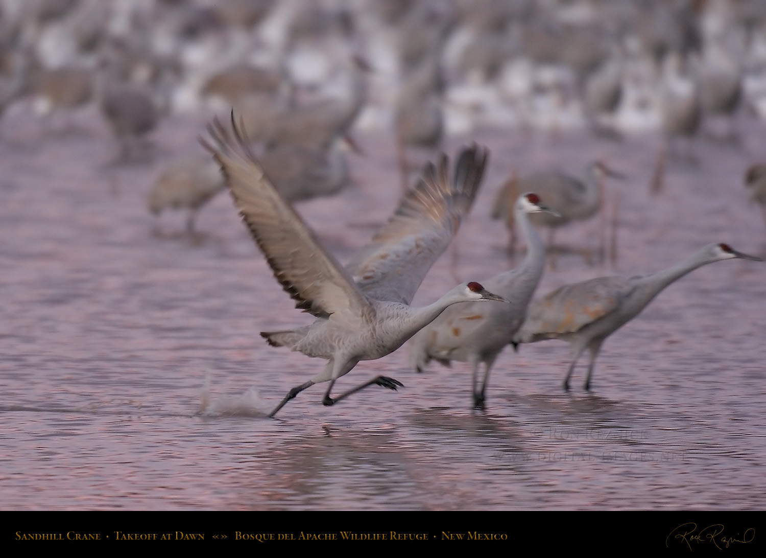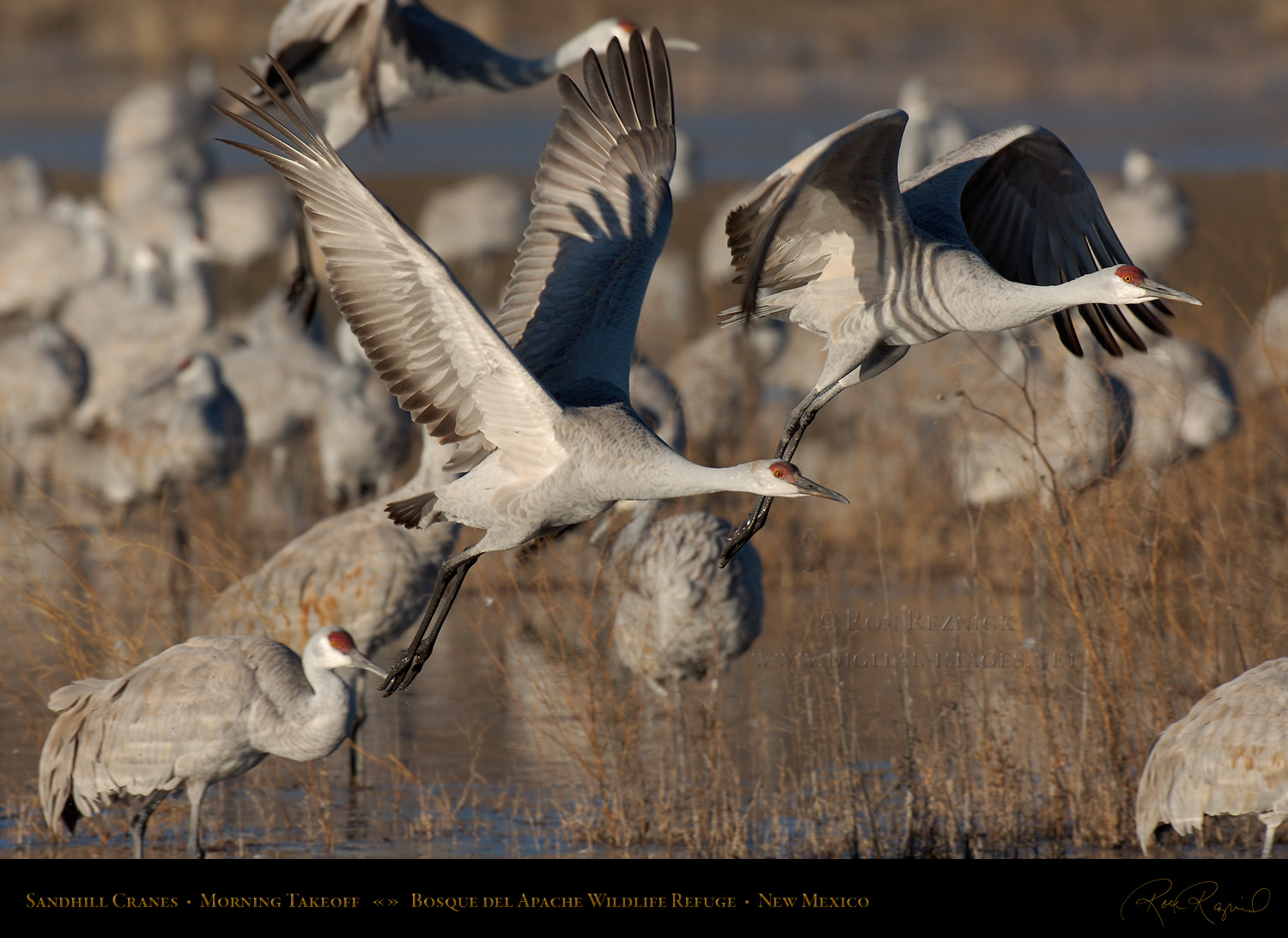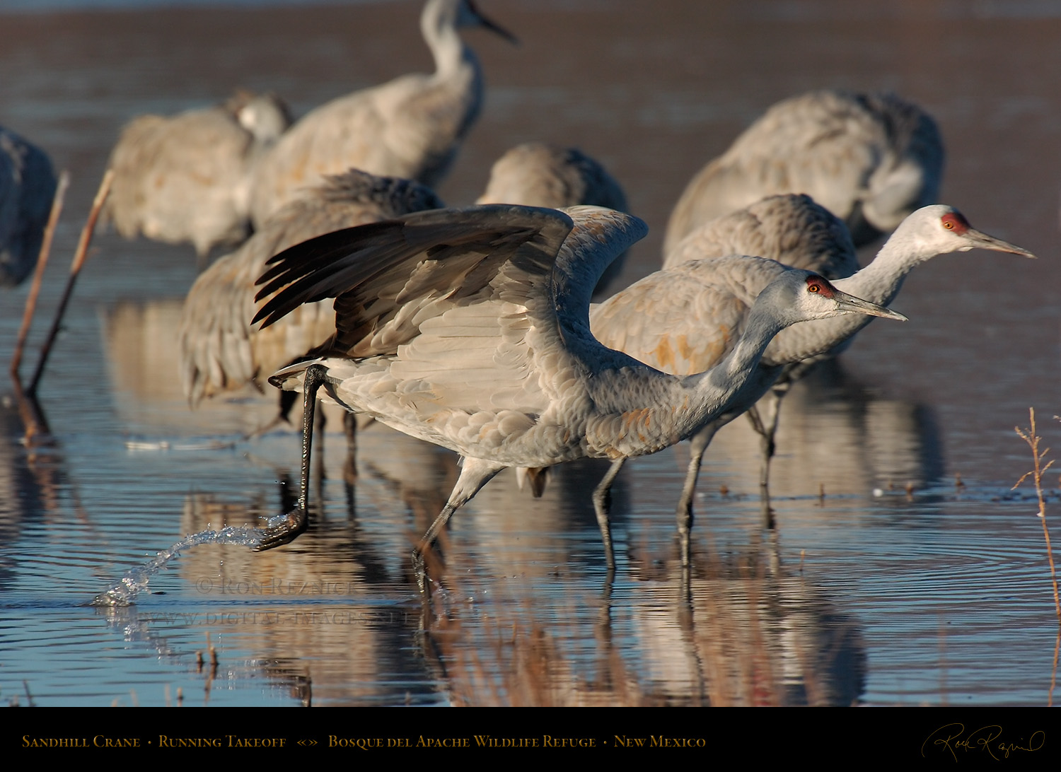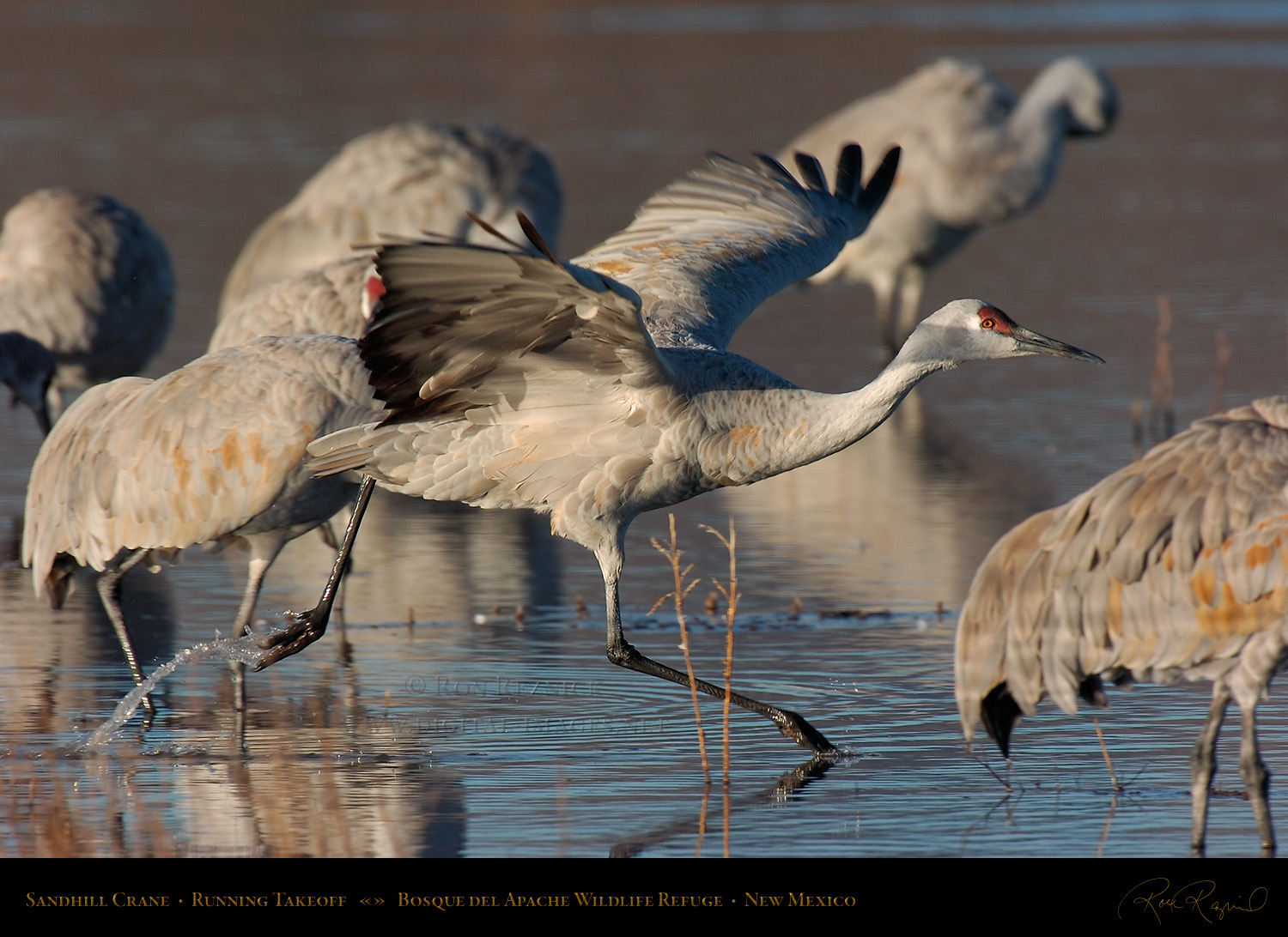 Sandhill Cranes leaving the Crane Pool at Bosque del Apache, shot at the moment of takeoff.