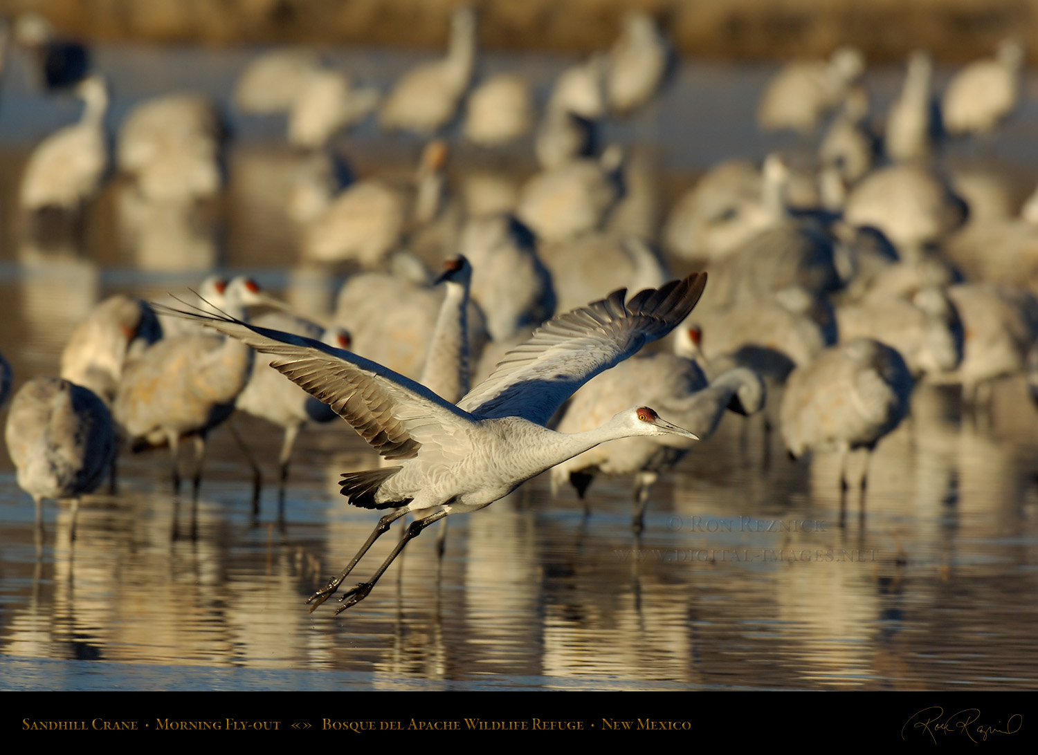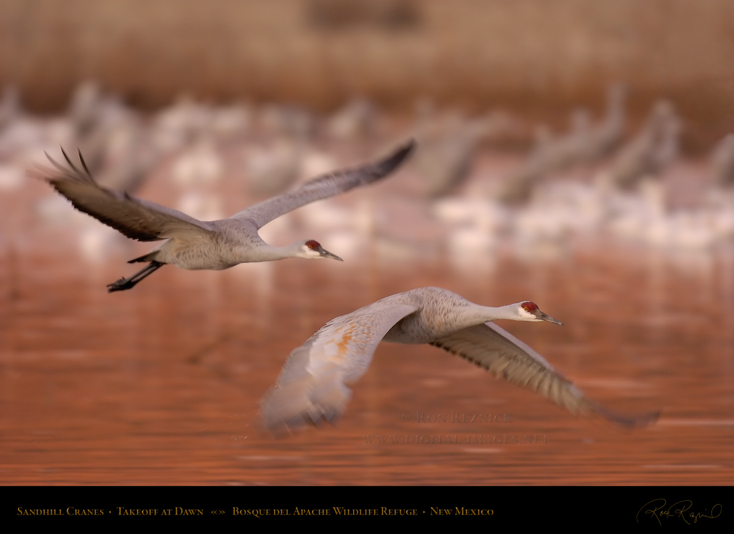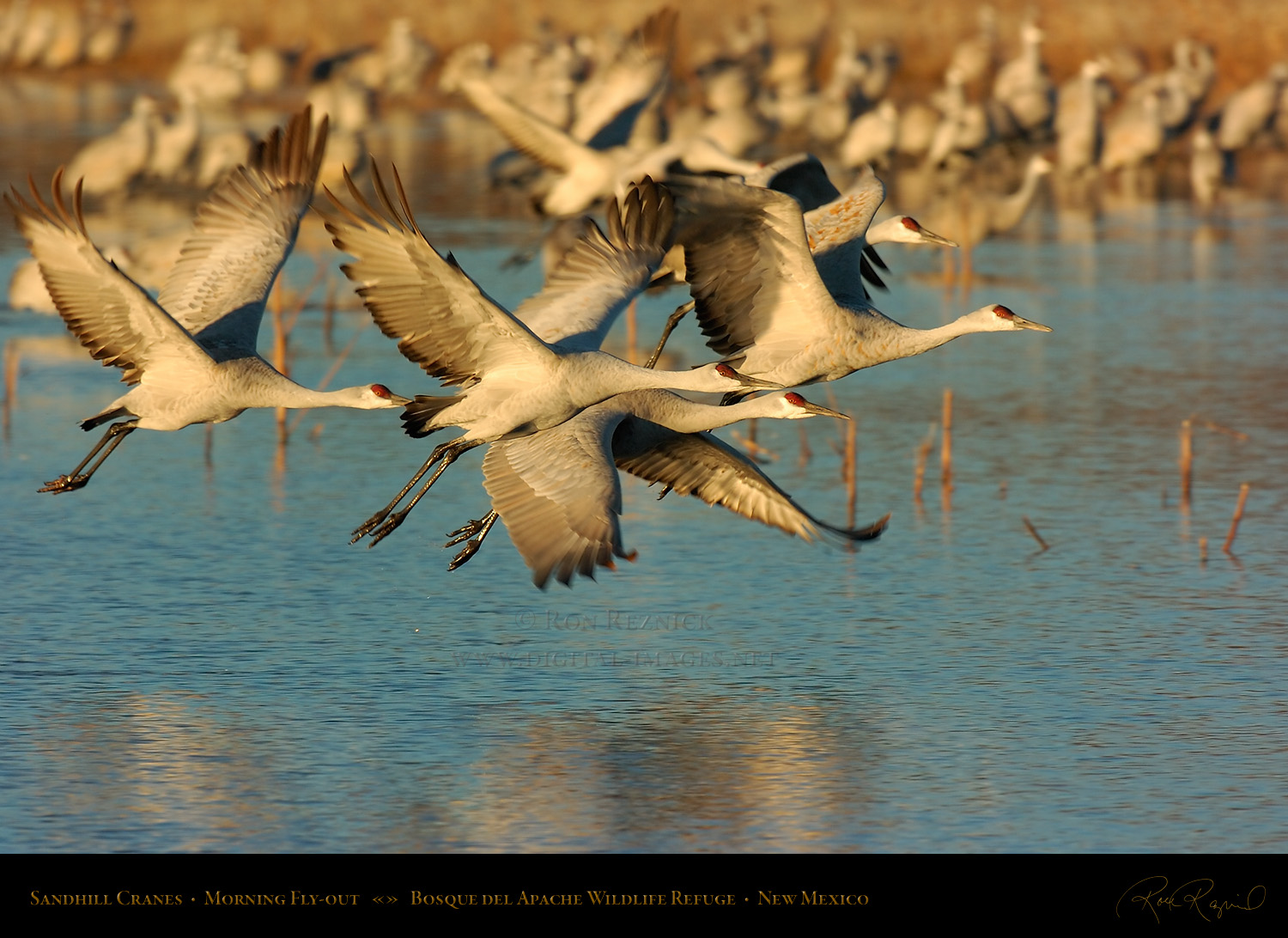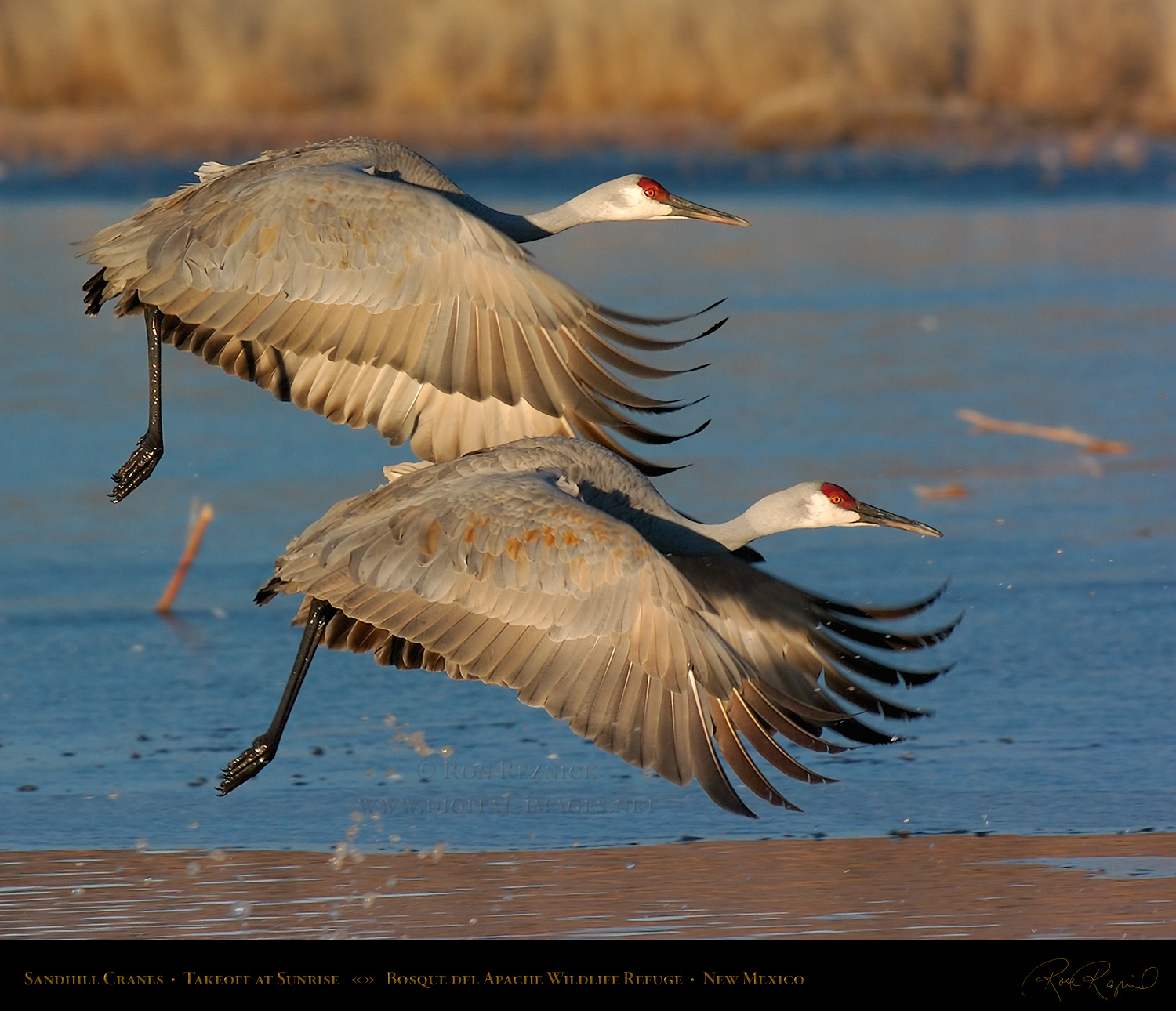 Sandhill Cranes leaving the Crane Pool at Bosque del Apache, shot at the moment of takeoff.