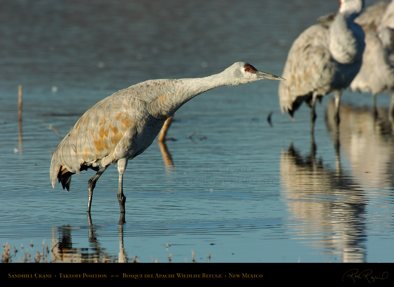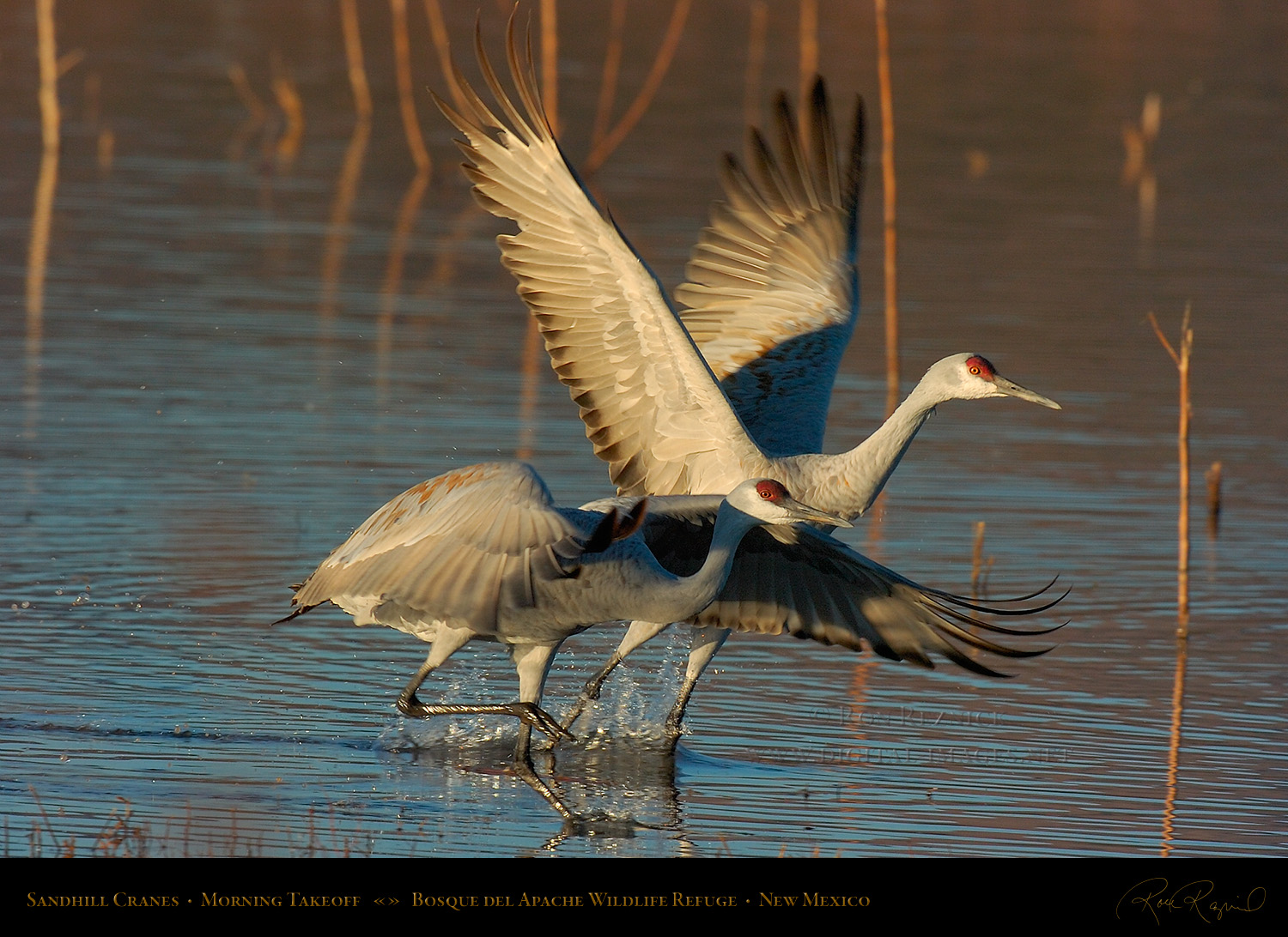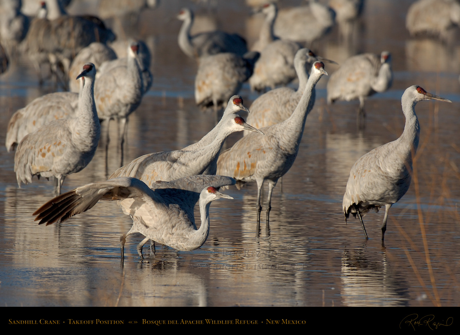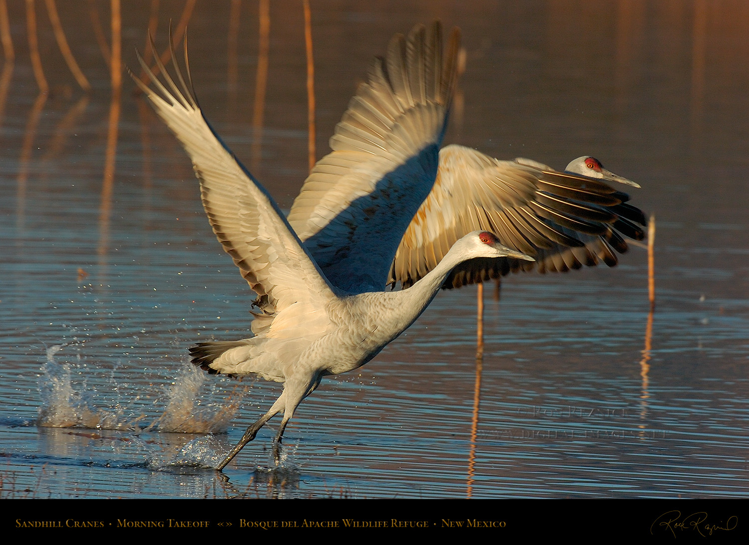 Sandhill Cranes leaving the Crane Pool at Bosque del Apache, shot at the moment of takeoff.