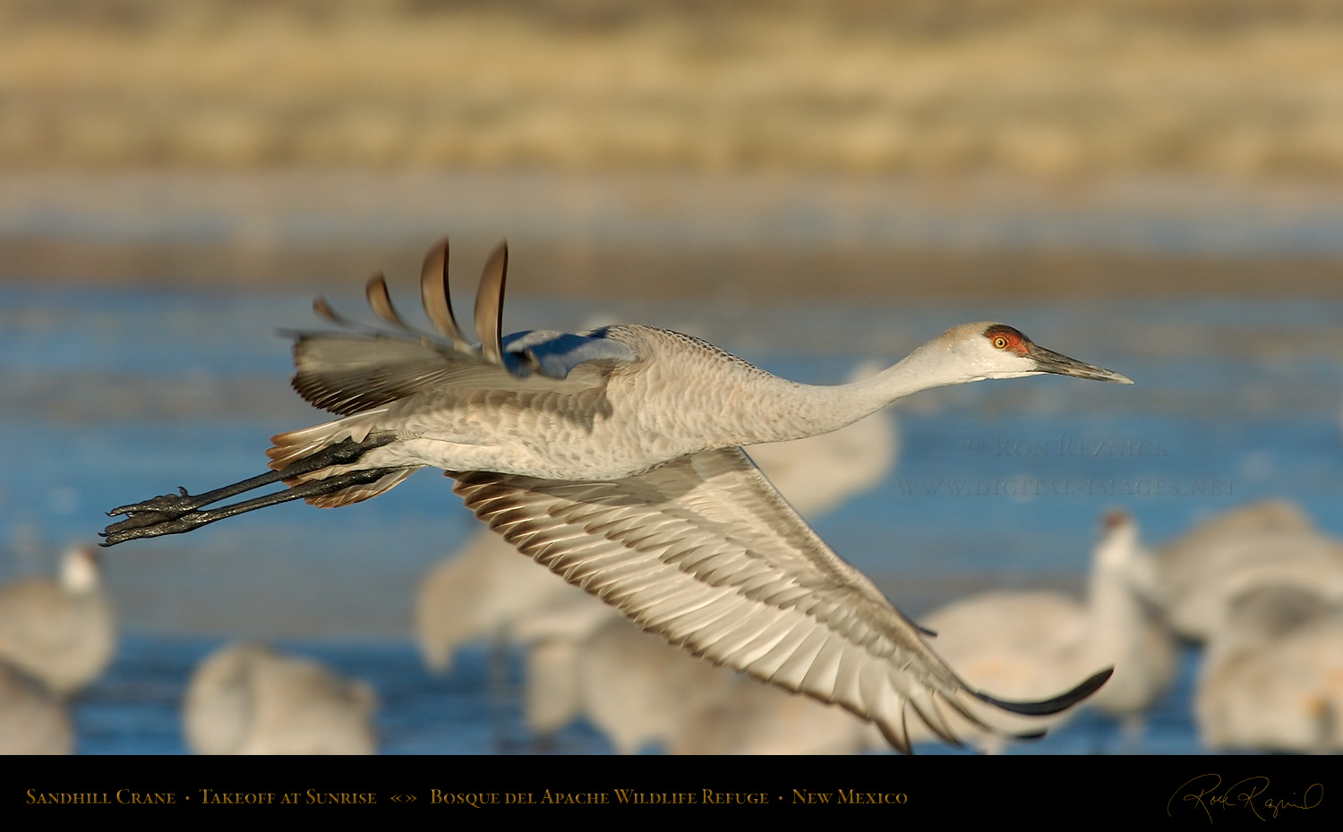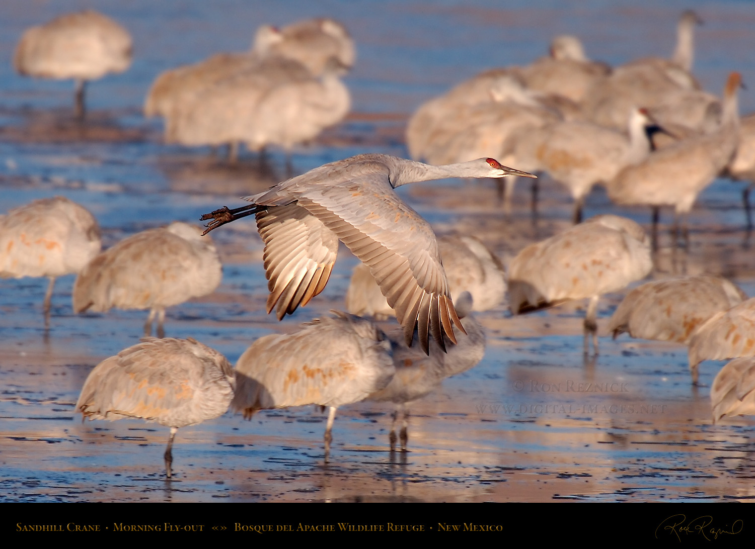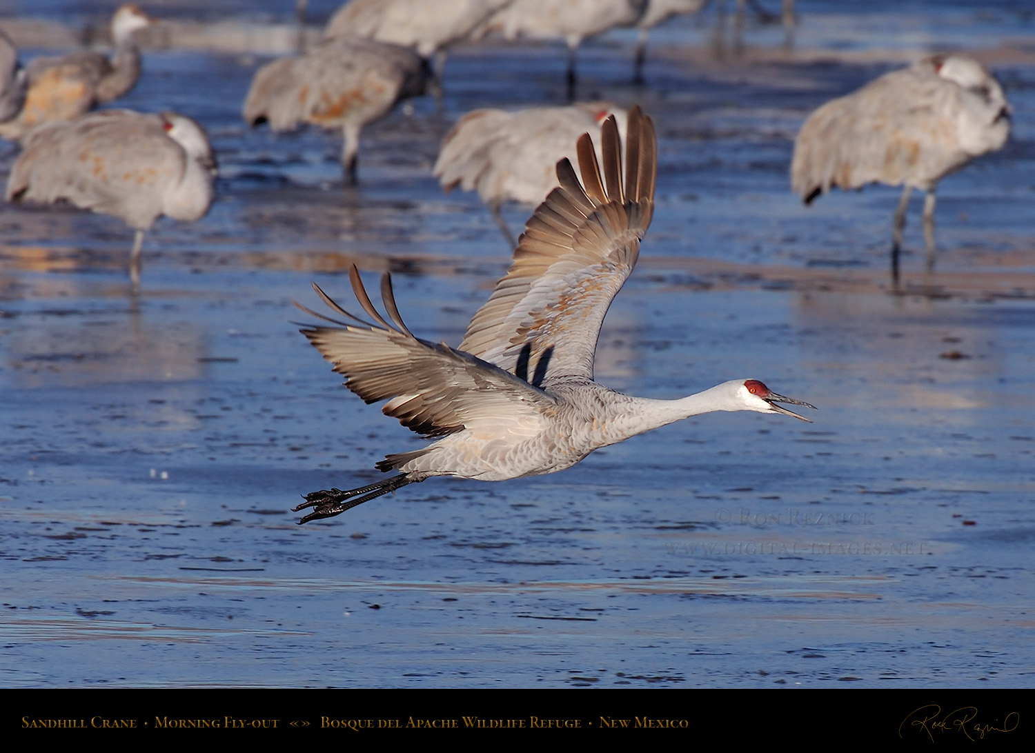 A Sandhill Crane flies out to the farm fields, leaving the pond and his sleeping fellows behind after breaking free of the ice on a cold January morning at Bosque del Apache.