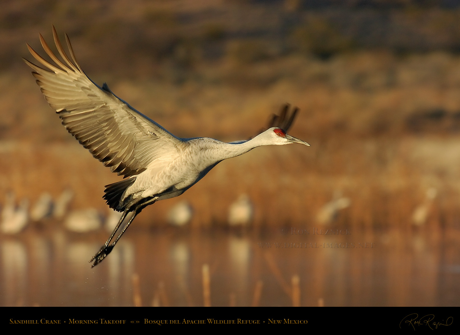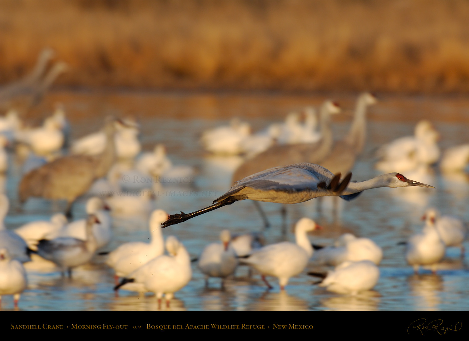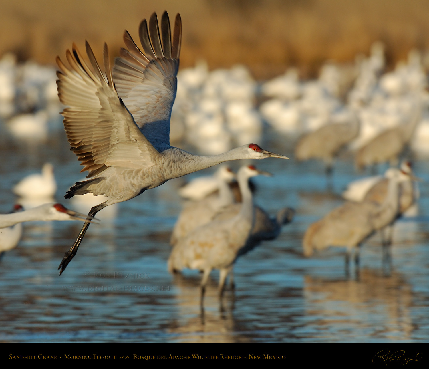 A Sandhill Crane flies out to the farm fields, leaving the pond and his sleeping fellows behind after breaking free of the ice on a cold January morning at Bosque del Apache.