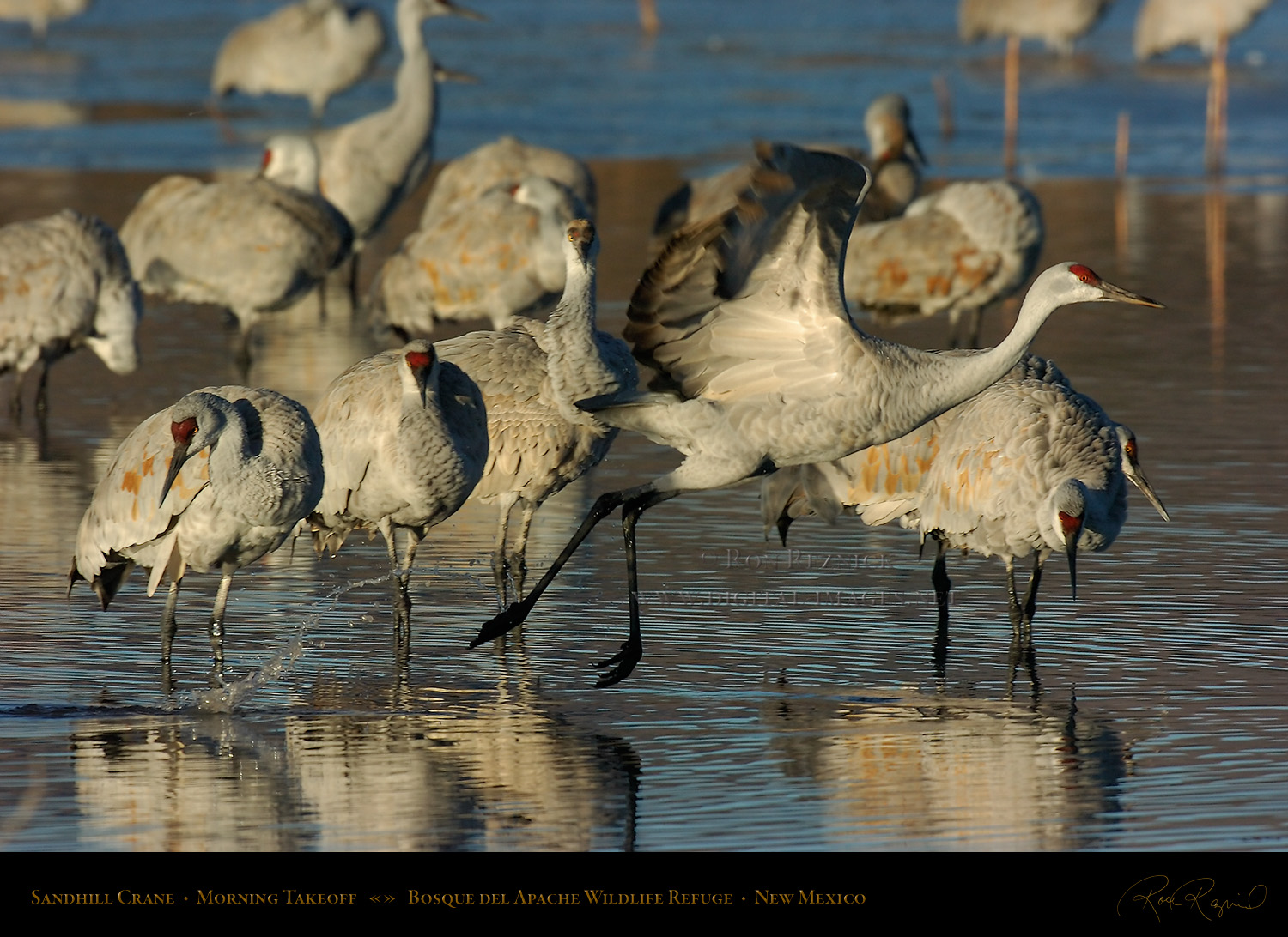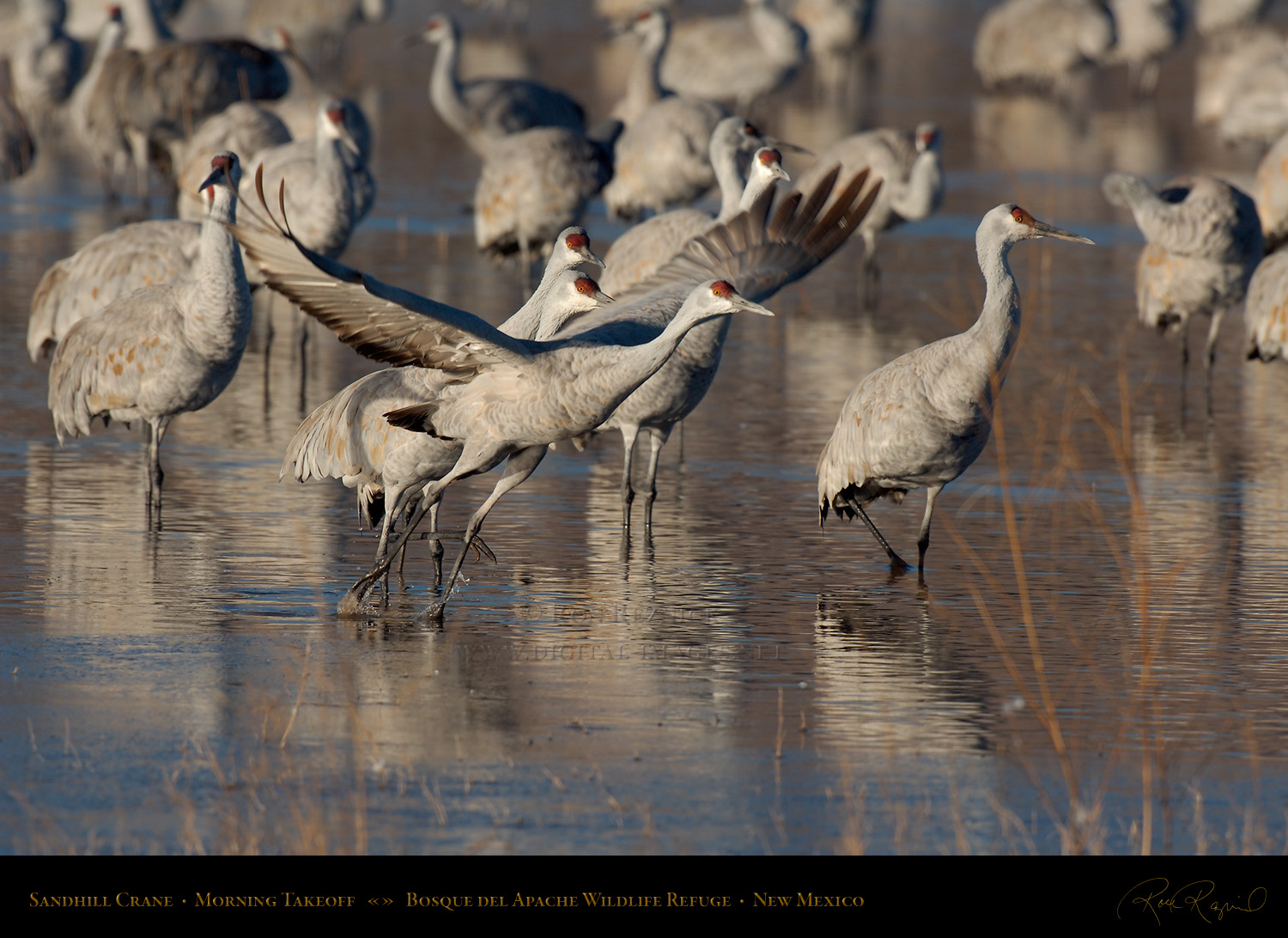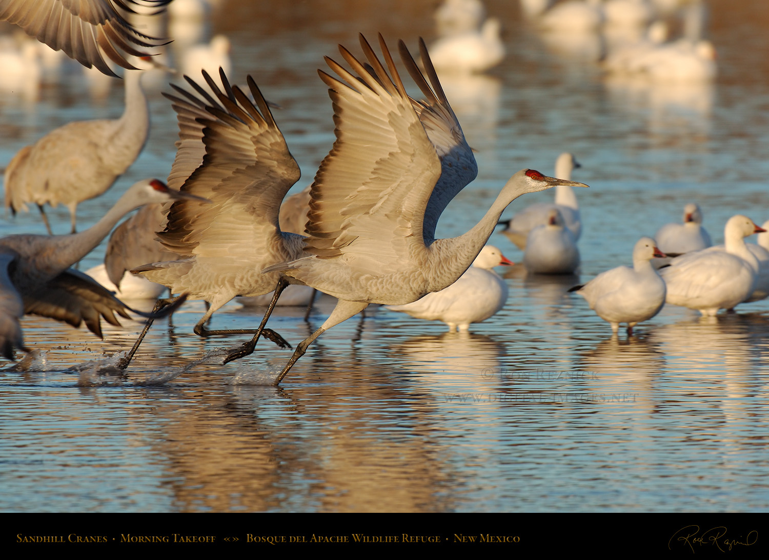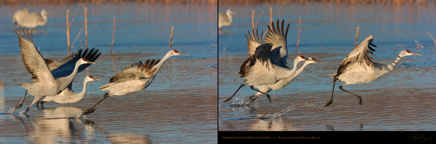 This page contains 61 images and composites of Sandhill Crane morning takeoffs at Bosque del Apache Wildlife Refuge in New Mexico. Sandhill Crane takeoffs usually involve long periods of waiting punctuated by frantic, action-filled bursts of activity.