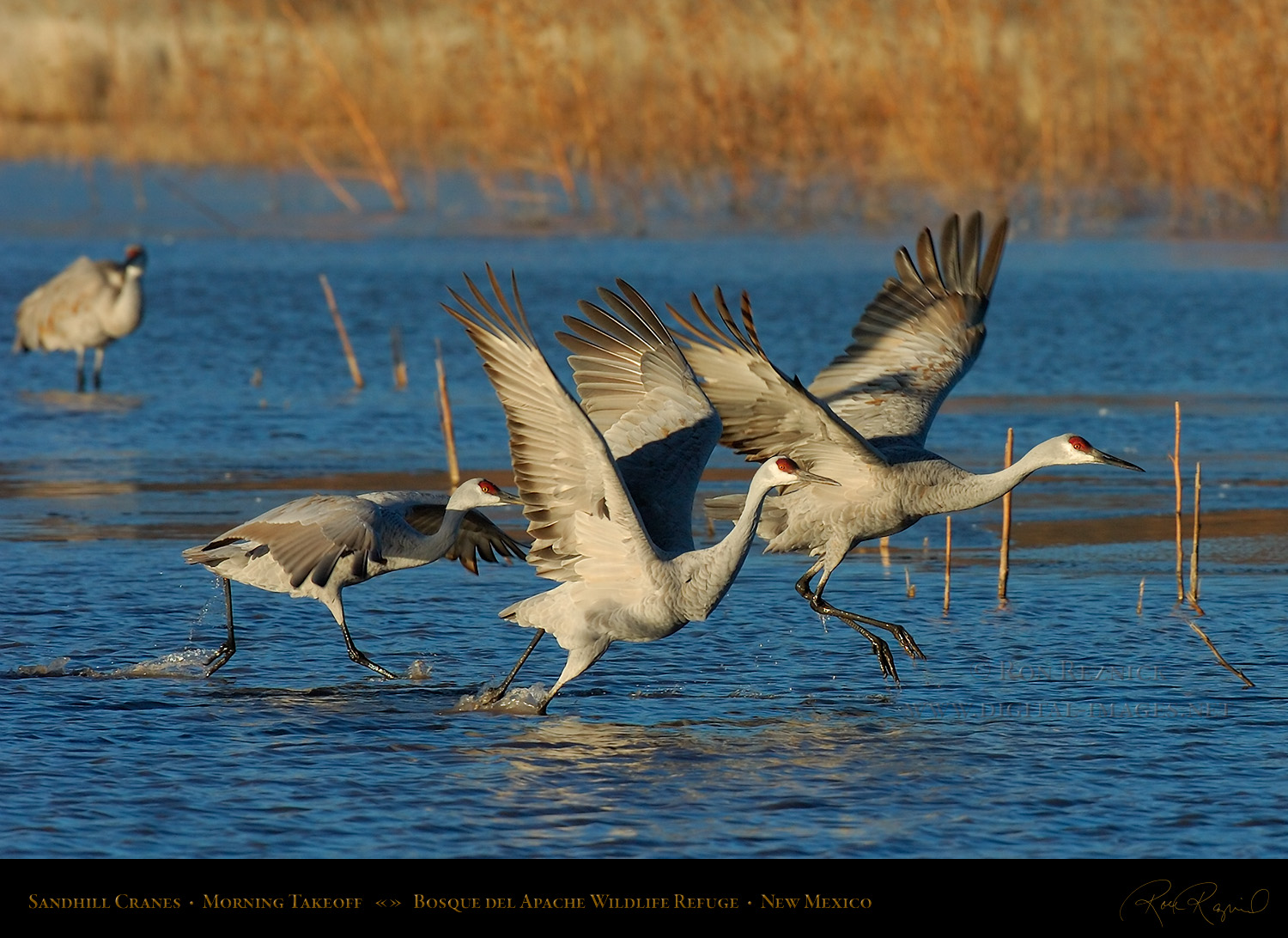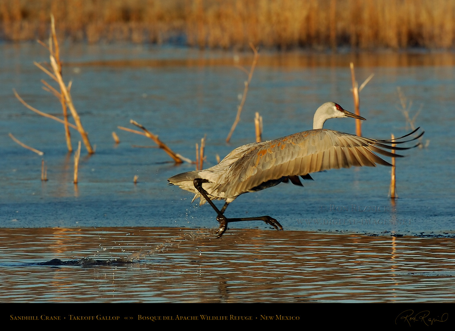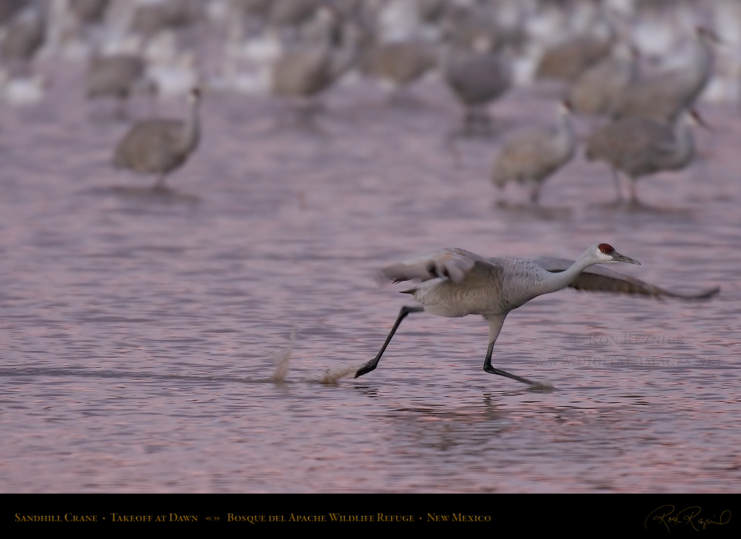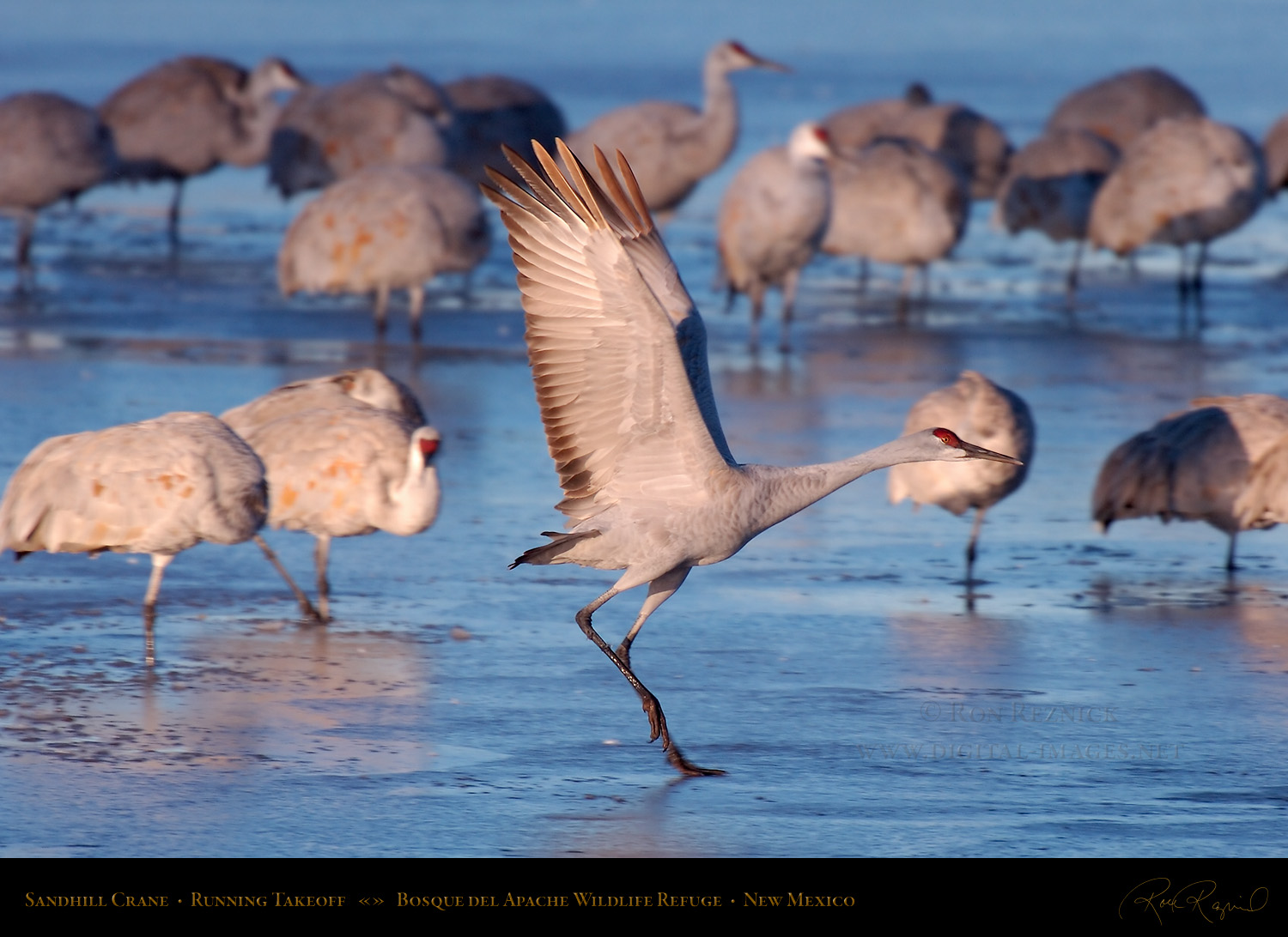 This page contains 61 images and composites of Sandhill Crane morning takeoffs at Bosque del Apache Wildlife Refuge in New Mexico. Sandhill Crane takeoffs usually involve long periods of waiting punctuated by frantic, action-filled bursts of activity.