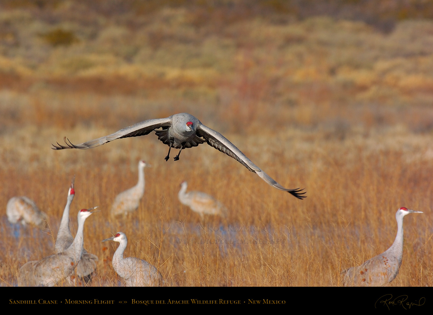 A Sandhill Crane performs an exciting, low-level close fly-by as it leaves the Crane Pool for the farm fields.