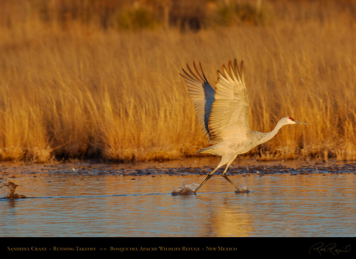 A Sandhill Crane runs to gain takeoff speed at sunrise.