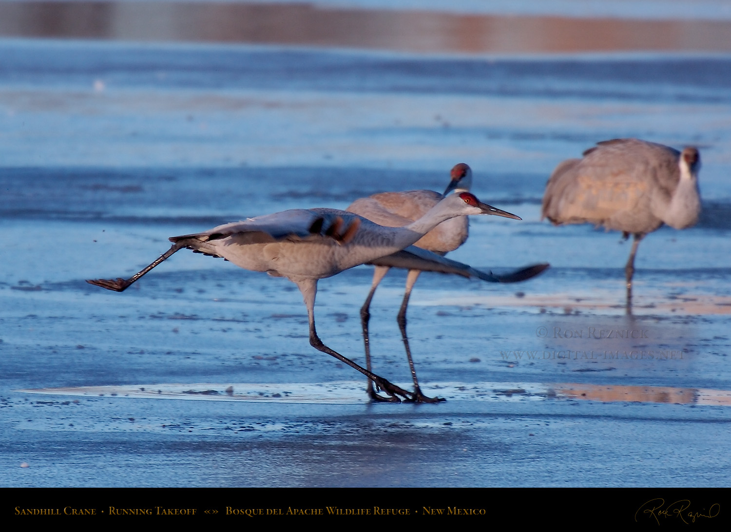Sandhill Cranes running to gather speed for takeoff at Bosque del Apache National Wildlife Refuge.