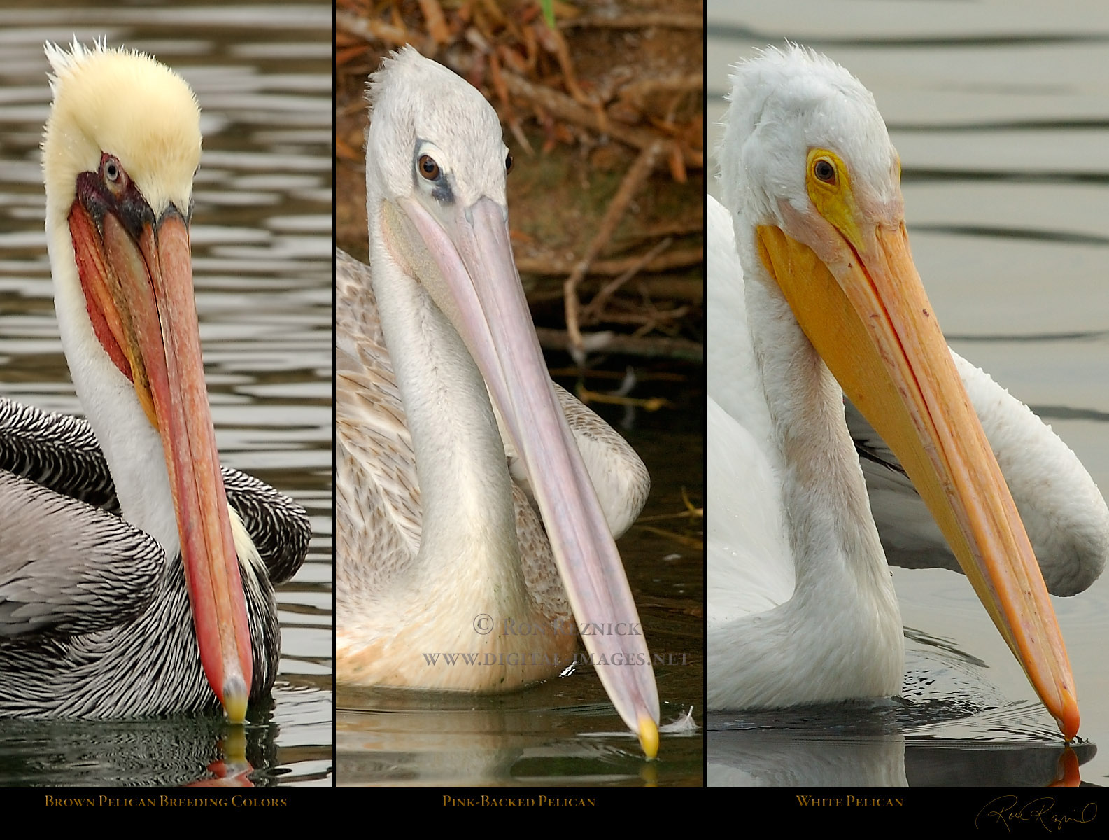 Brown Pelican in Breeding Colors, Pink-Backed Pelican, and White Pelican.